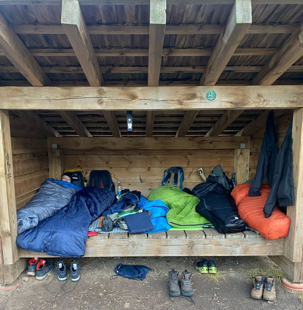 Reaching our campsite, we threw our backpacks into a small wooden hut that looked like a bus stop and sat for a few minutes to finally catch our breath after the long day. Some of us continued to rest, while others started a fire and boiled water for everyone. Luckily, the area where we slept already had a huge pile of firewood, saving us both time and energy. One of the guys used a gas stove to boil water from the Gauja River, while I stuck to more traditional survival techniques and boiled over the fire in my pot.